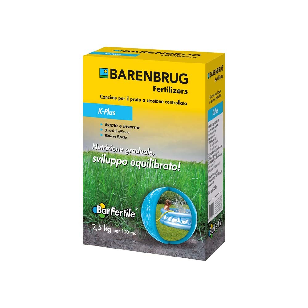 BarFertile K-Plus è un concime granulare (SGN 240) a cessione controllata (rilascio controllato), ricco di potassio (K), specifico per la concimazione estiva e invernale del prato e delle piante ornamentali da giardino. Grazie al 30% di N ricoperto (Tecnologia MultiCoTech o MCT®), BarFertile K-Plus garantisce un rilascio ottimale degli elementi nutritivi, prevenendo eventuali carenze o dannosi eccessi degli stessi; una sensibile riduzione del processo di lisciviazione; un minore impatto ambientale sulla microflora e la fauna del terreno e, non ultimo, una piena corrispondenza fra la curva di crescita della pianta e quella di rilascio del prodotto per un'efficienza massima (al momento opportuno!). Non provoca bruciature. Prodotto non polverulento.