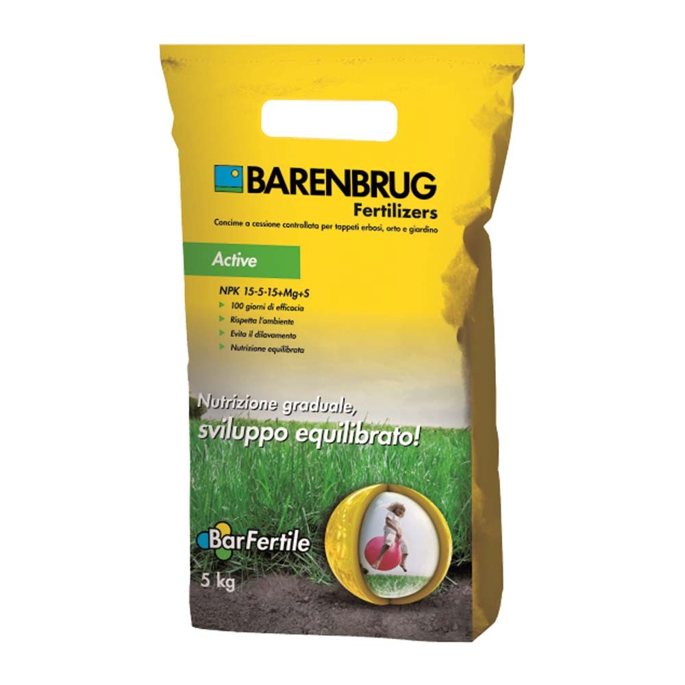 Con un rapporto N:K pari a 1:1, BarFertile Active assicura una crescita equilibrata del tappeto (e di tutte le piante da giardino) durante ogni mese di crescita attiva. L'azoto a cessione controllata garantisce un'efficacia del prodotto fino a 100 giorni.